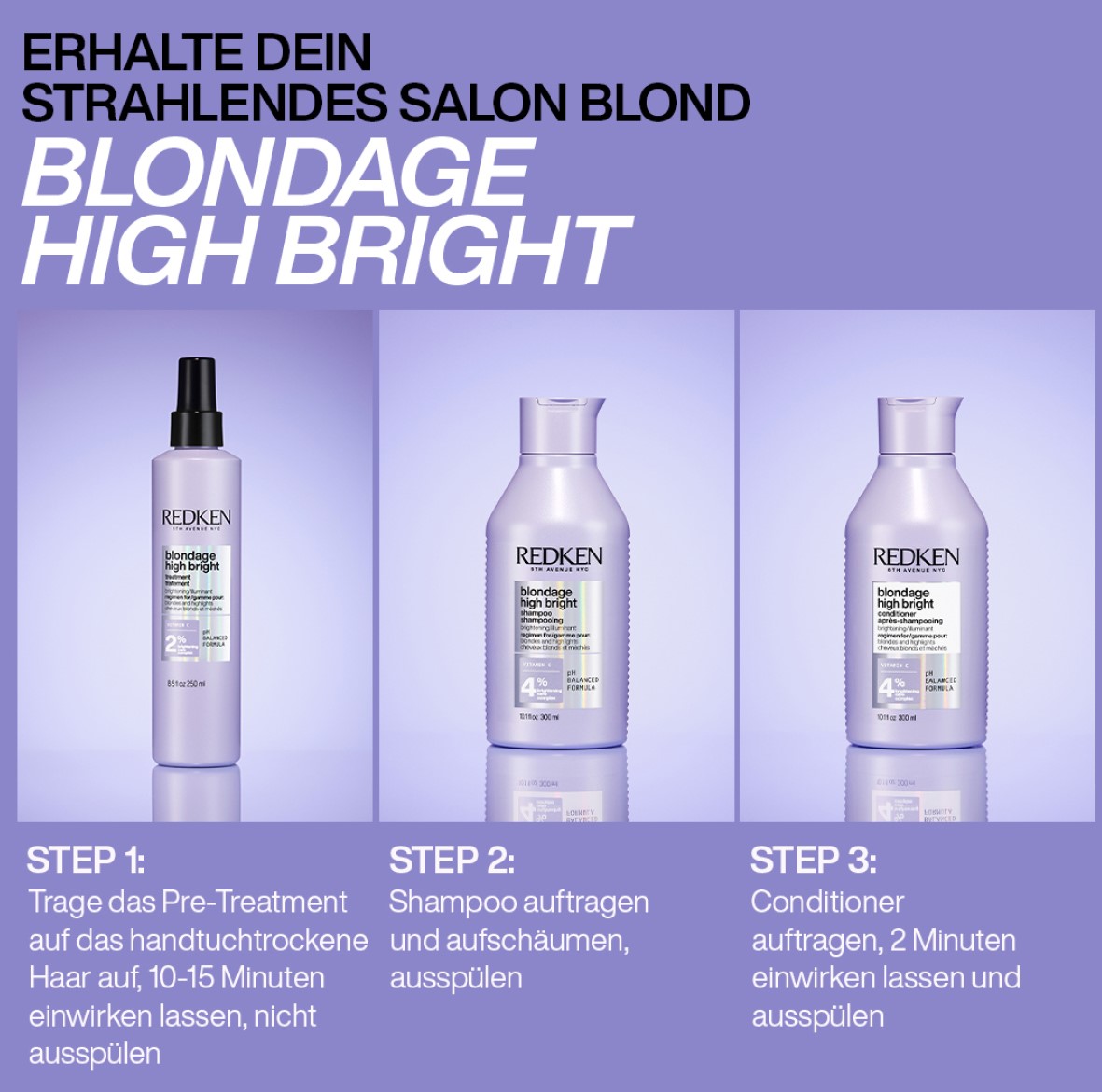 Das Pre-Treatment für 5-10 Minuten einwirken lassen – nicht ausspülen, Shampoo auftragen und anschließend gemeinsam auswaschen. Abschließend den Conditioner auftragen und 2 Minuten einwirken lassen. Die Routine kann bis zum gewünschten Aufhellungsergebnis wiederholt werden. Wenn das Aufhellungsergebnis erreicht ist, das Pre-Treatment und das Shampoo mit einem beliebigen Redken Shampoo austauschen. Die Serie sollte als gesamte Haarpflegeroutine betrachtet werden - optimale Ergebnisse werden erzielt wenn Pre-Treatment, Shampoo und Conditioner genutzt werden.